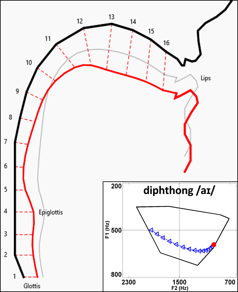 Modelling Diphthong Dynamics. My strong interest in diphthong-formant transitions arose from my PhD work, which focused on mathematical representations capable of yielding meaningful interpretations in articulatory-phonetic terms. The figure shown above at left is a brief example. It portrays the tongue position at the start of an Australian English diphthong (/aI/), and its acoustic realisation is seen in the inlay graph as a nonlinear formant trajectory (blue-coloured) between two target regions of the acoustic-phonetic space. The (red-coloured) contour of the tongue body in the figure is actually predicted from formant-frequencies measured at onset of the diphthong movement - this is what is broadly called vocal-tract shape modelling. My long-term objective is to exploit the link between vocal-tract and formant movements as an explanatory basis for the time-dependent dynamics and the speaker-dependent variability of diphthongs.