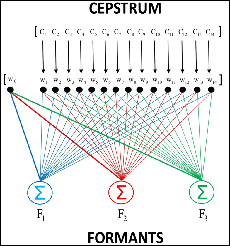 Cepstrum-to-Formant Estimation. My research endeavours clearly depend on being able to measure formant frequencies from the speech signal with a certain degree of robustness. However, even the best methods available to date are prone to catastrophic errors. I have therefore been investigating a potentially more robust approach based on the cepstrum. This acoustic parameter cannot readily be decomposed into formants, but it can be extracted without measurement uncertainties. The solution depicted in the figure shown above at right consists of a multiple-linear regression model to map cepstral coefficients onto formant frequencies. Although the relationship between cepstra and formants is intrinsically nonlinear, there is some promising evidence of linearity in local regions of those two parameter spaces. Using cepstral representations of individual vowels and voiced fillers extracted from spontaneous speech, I have found formant estimates to never be wrong even in cases where they are not highly accurate. These fndings warrant further evaluation of the apparent robustness in cepstrum-to-formant estimation via linear regression.